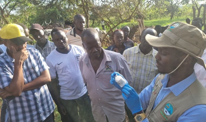 The District Veterinary Officer, Dr. David Nelson Okello, demonstrated the vaccination process during the meeting, showing veterinary officers and farmers how the vaccine is administered to cattle.